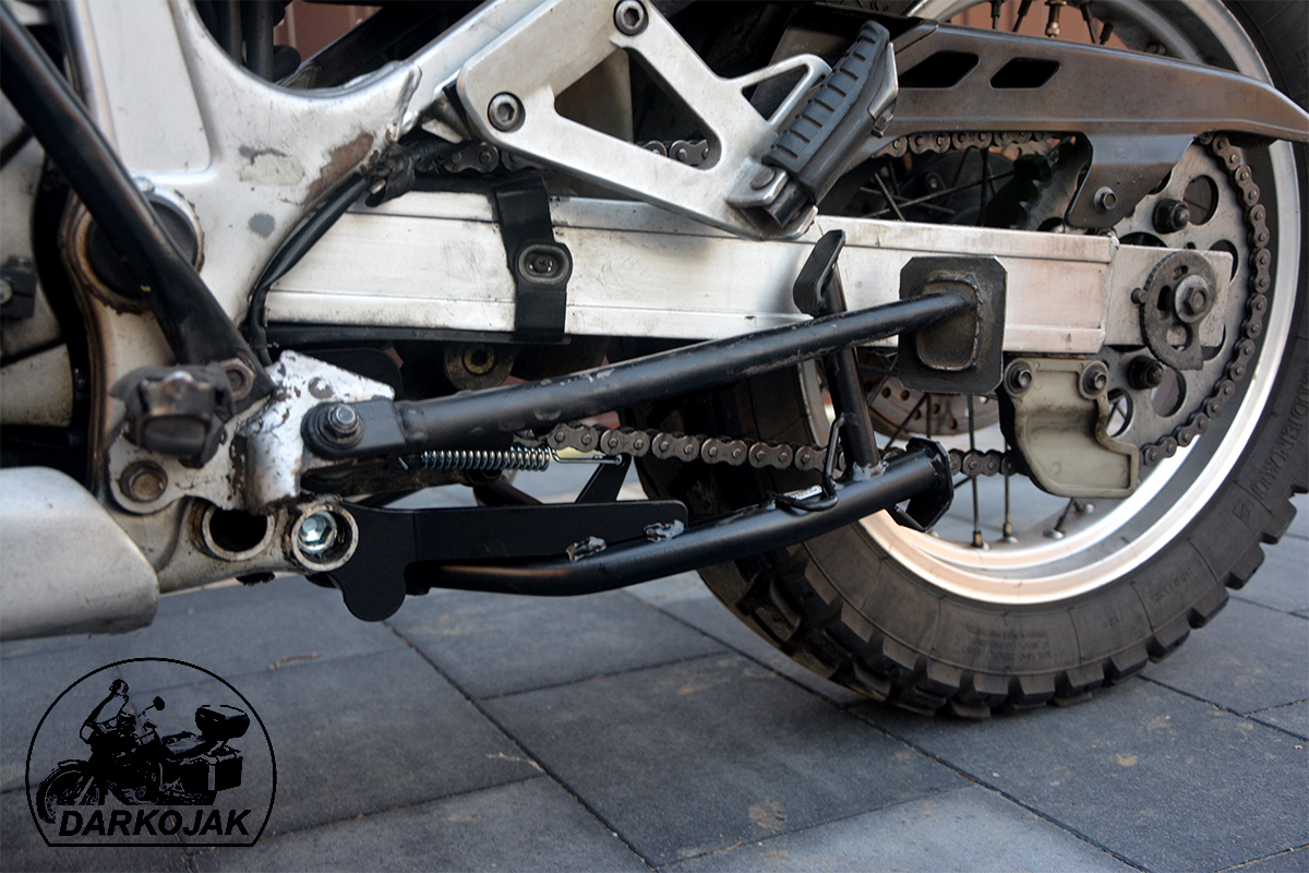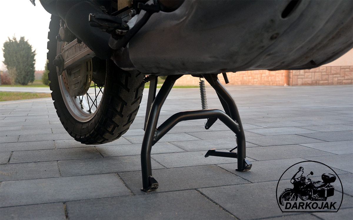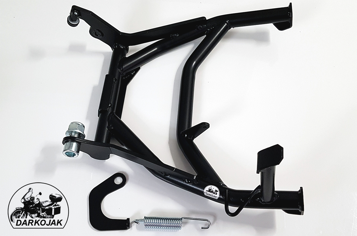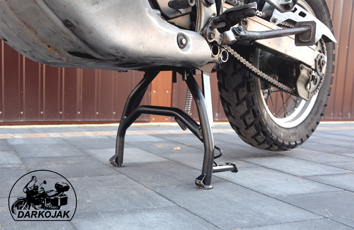 Większość tych motocykli fabrycznie posiada tylko stopkę boczną. Jednak przy wszelkich pracach serwisowych a szczególnie w trasie stopka centralna jest niezbędna. Stopka wykonana jest z giętych na specjalnej maszynie CNC rur. Posiada wzmocnienia z blachy cięte laserowo. Posiada specjalny odbojnik z tworzywa dzięki czemu bardzo łagodnie się składa - nie uderza. Poniżej zdjęcia jak to wygląda.