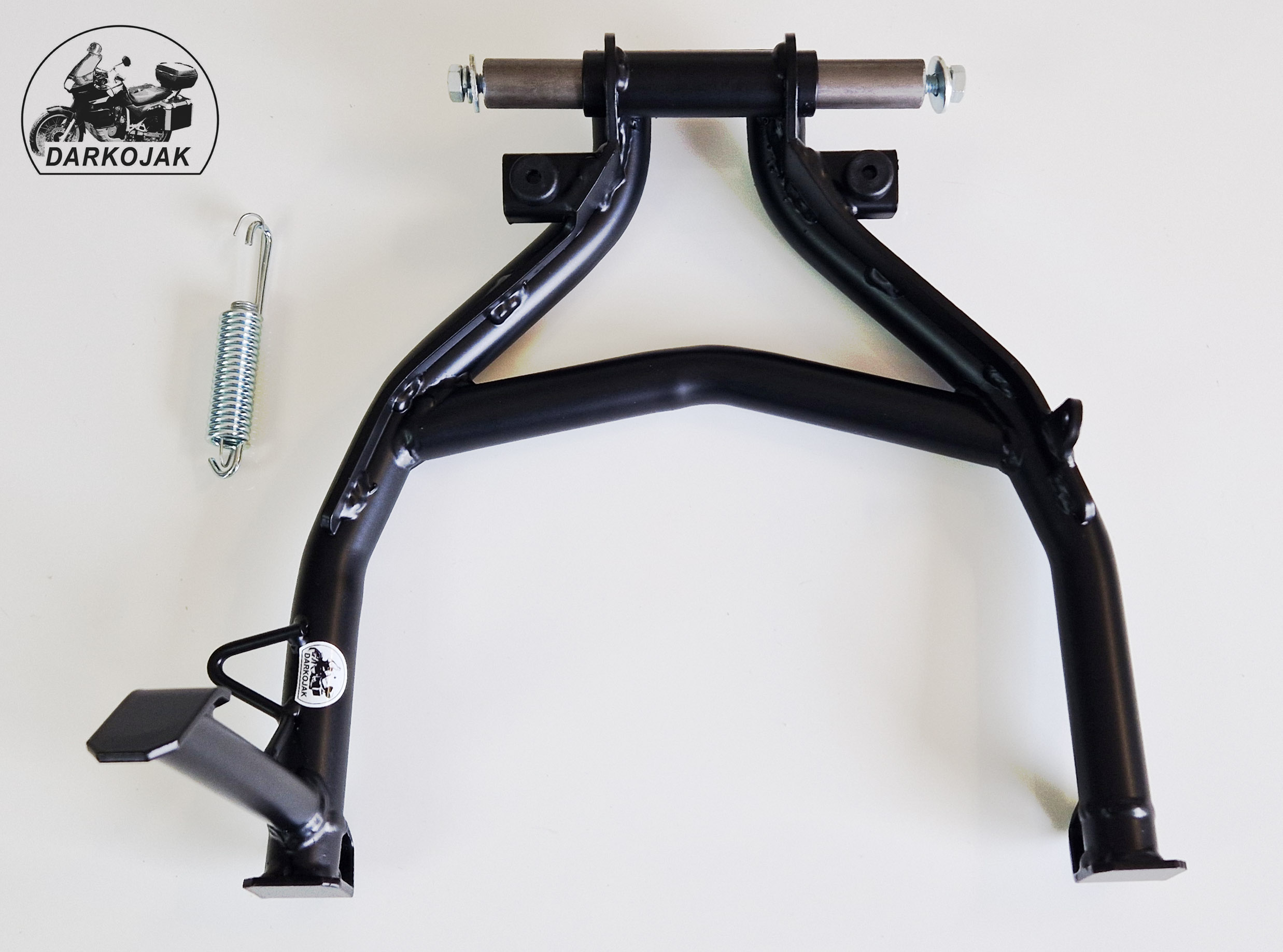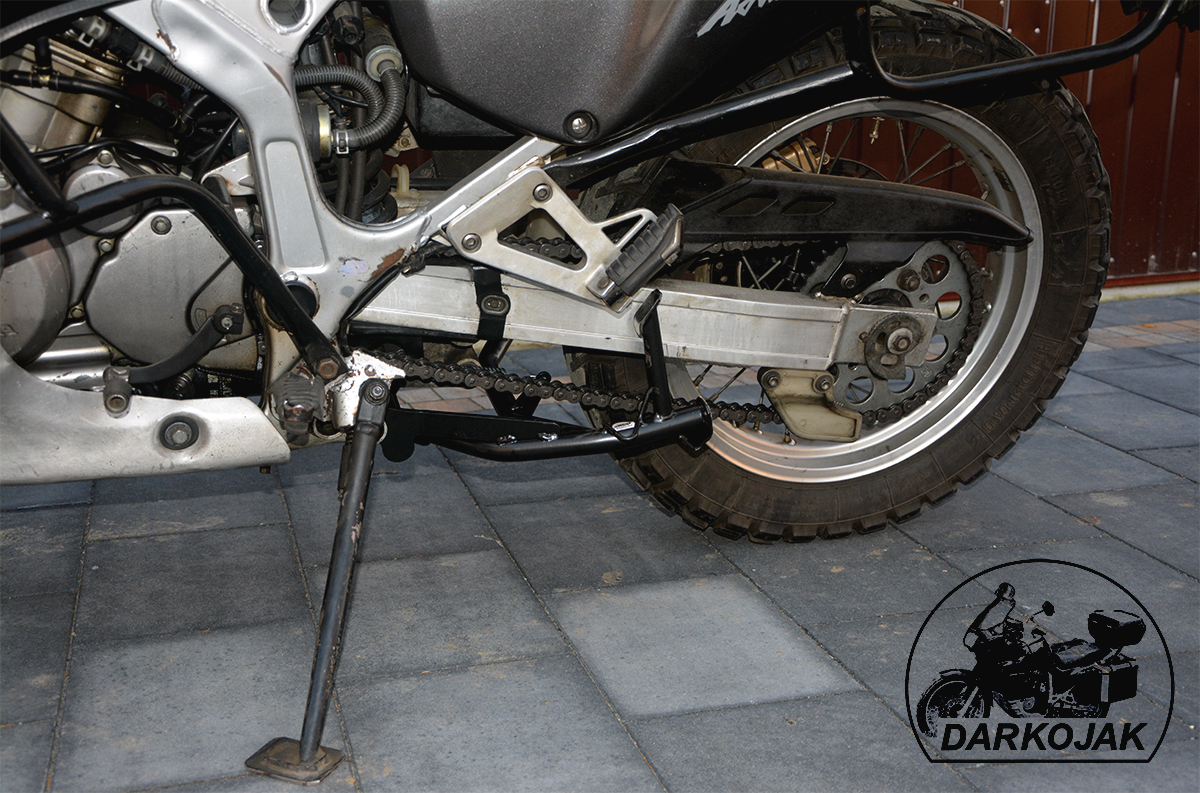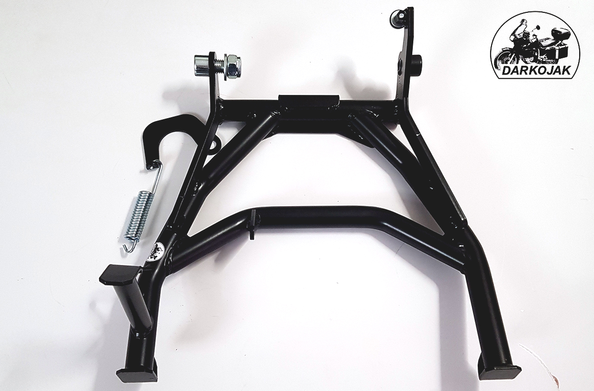 Większość tych motocykli fabrycznie posiada tylko stopkę boczną. Jednak przy wszelkich pracach serwisowych a szczególnie w trasie stopka centralna jest niezbędna. Stopka wykonana jest z giętych na specjalnej maszynie CNC rur. Posiada wzmocnienia z blachy cięte laserowo. Posiada specjalny odbojnik z tworzywa dzięki czemu bardzo łagodnie się składa - nie uderza. Poniżej zdjęcia jak to wygląda.